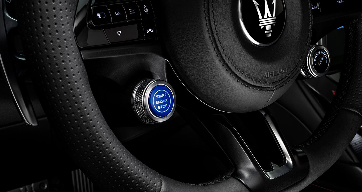 また、マセラティは伝統的にインテリアの仕立てに定評のあるメーカーだ。近年、ダッシュパネル中央に凝った時計を装着する自動車ブランドが増えているが、マセラティがその流れを作った張本人ともいえる。新型も上質なレザーでトリムされたパネル中央に、ブルーに輝くスマートウォッチを装着した。デジタルなので表示内容を変えられる仕様となっている。