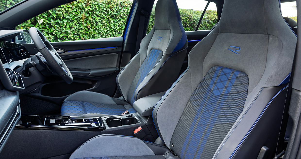 マイナーチェンジのポイントは、内外装とメカニズムの両方にある。フロントバンパーをはじめ、前後ランプの意匠が変更された。室内では、ゴルフR専用のバケットシートは継続しつつ、Rアドバンスにはナッパレザー表皮が与えられ、質感が一段と高まった。パワートレインにも手が入った。2.0リッター、直列4気筒ターボエンジンの最高出力は320psから333psへと向上。さらに、これまでオプションだった可変ダンピングコントロール「DCC(アダプティブシャシーコントロール)」が標準装備となった点も見逃せない。