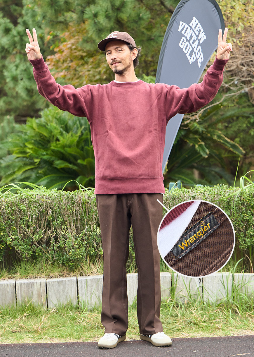 ヴィンテージのワインカラーのスウェットに、ゴルフ以外でも履いているというWrangler(ラングラー)製ブラウンパンツをセレクト。今季のトレンド色をしっかりと押さえているところはさすが!