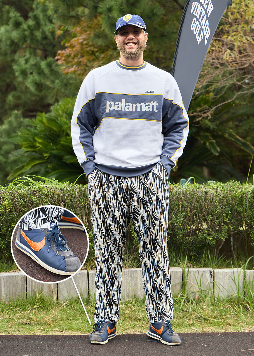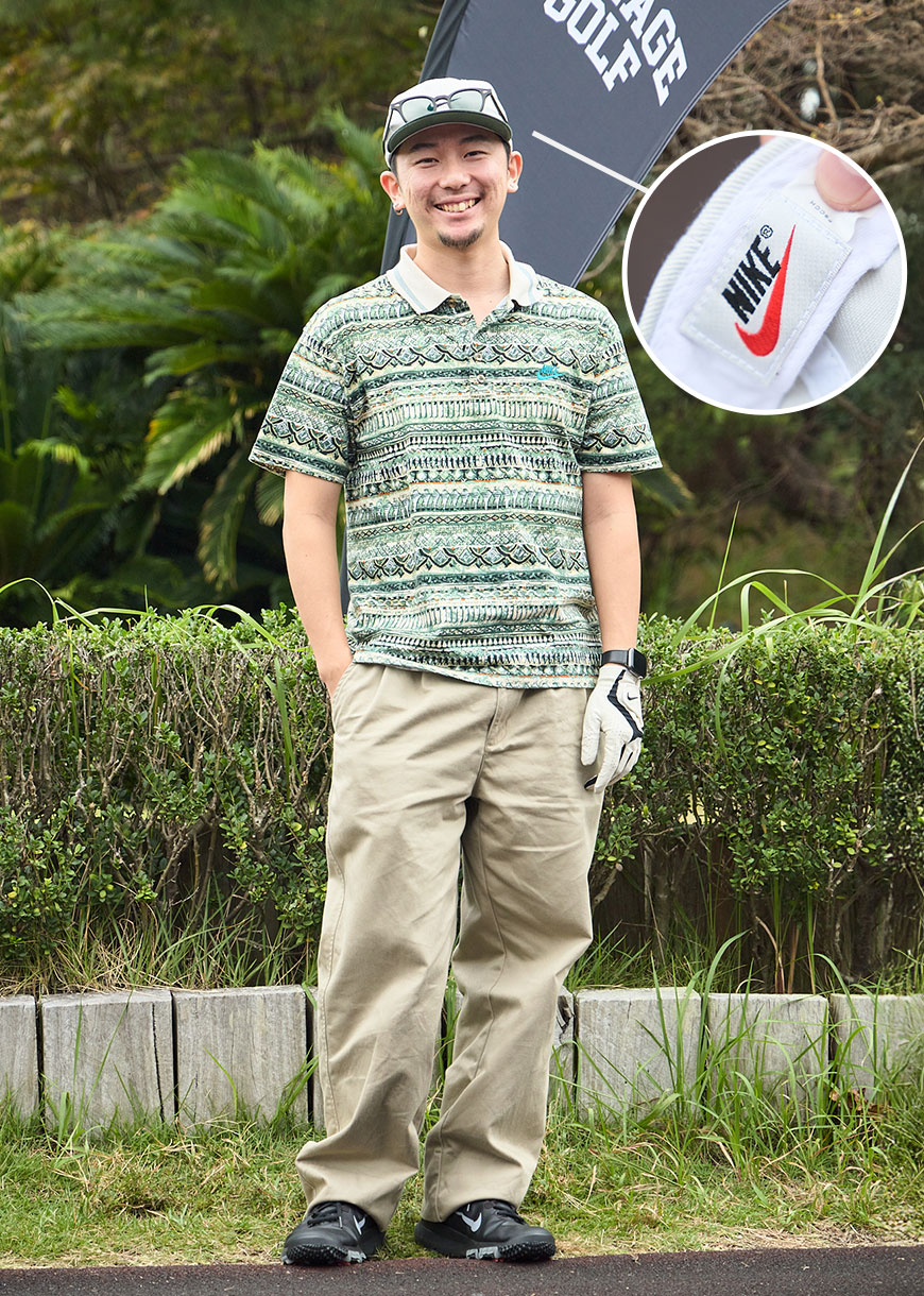 全身ナイキのアイテムはすべてヴィンテージ。ナイキの白キャップは通称“銀タグ”と呼ばれ、90年代に流通していたモデルだとか。伝統的な総柄ポロシャツが個性的。