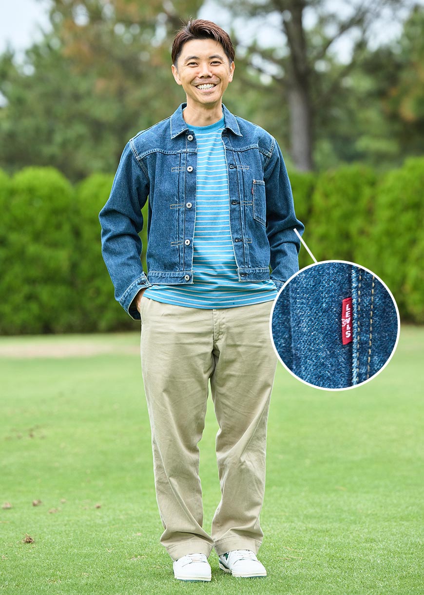 ラルフローレンのカウボーイジャケットを主役に、ショート丈のバミューダパンツを合わせて軽快に。ハットやRRL(ダブルアールエル)のスカーフなど、小物使いが光りました。