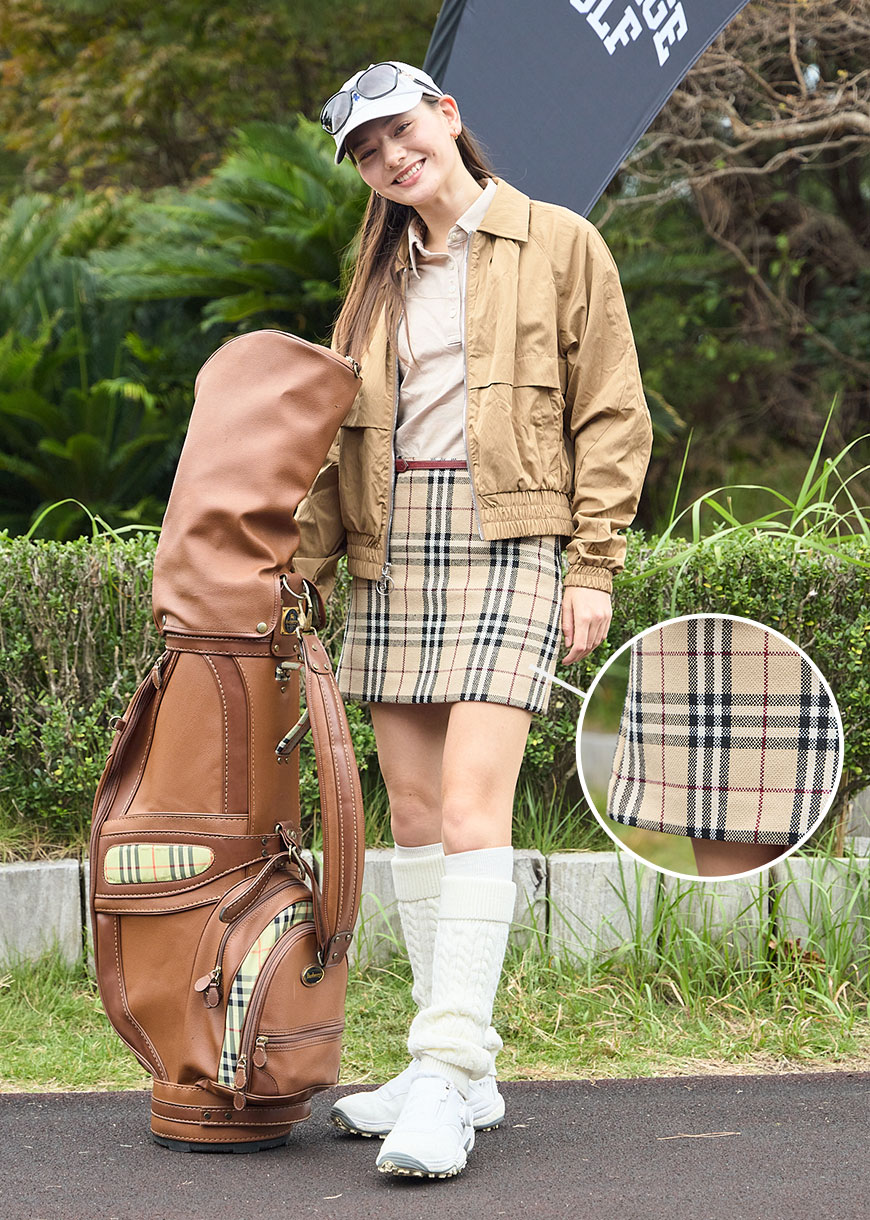 クラシカルなバーバリーのスカートをゴルフ用にアレンジし、ベージュのワントーンで仕上げたコーディネート。ブラウンのキャディバッグも年代物のバーバリー。