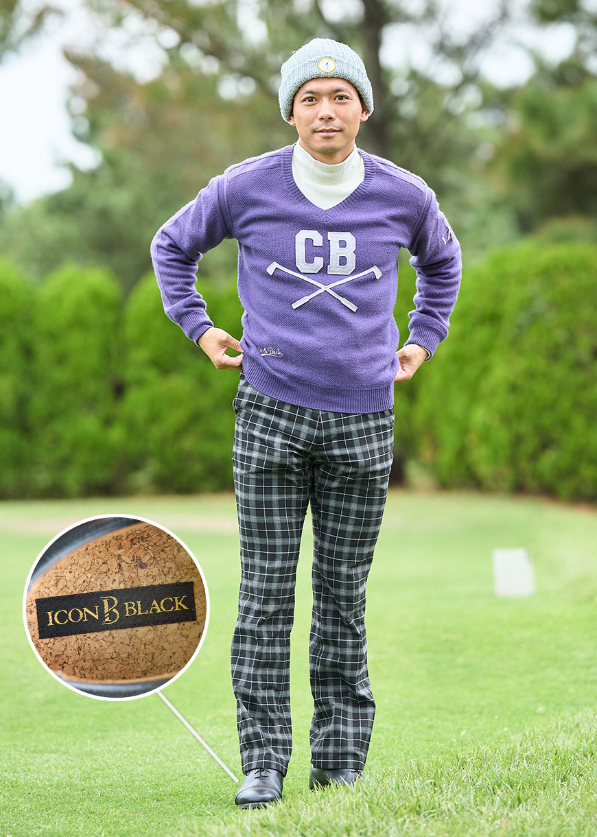 かつて今田竜二プロがPGAツアーでプレーしていた頃、着用していた「CUTTER&BUCK(カッターアンドバック)」のニットとパンツをセレクト。ゴルフシューズはインソールがコルク製の「ICON BLACK」とこれまたレアもの。