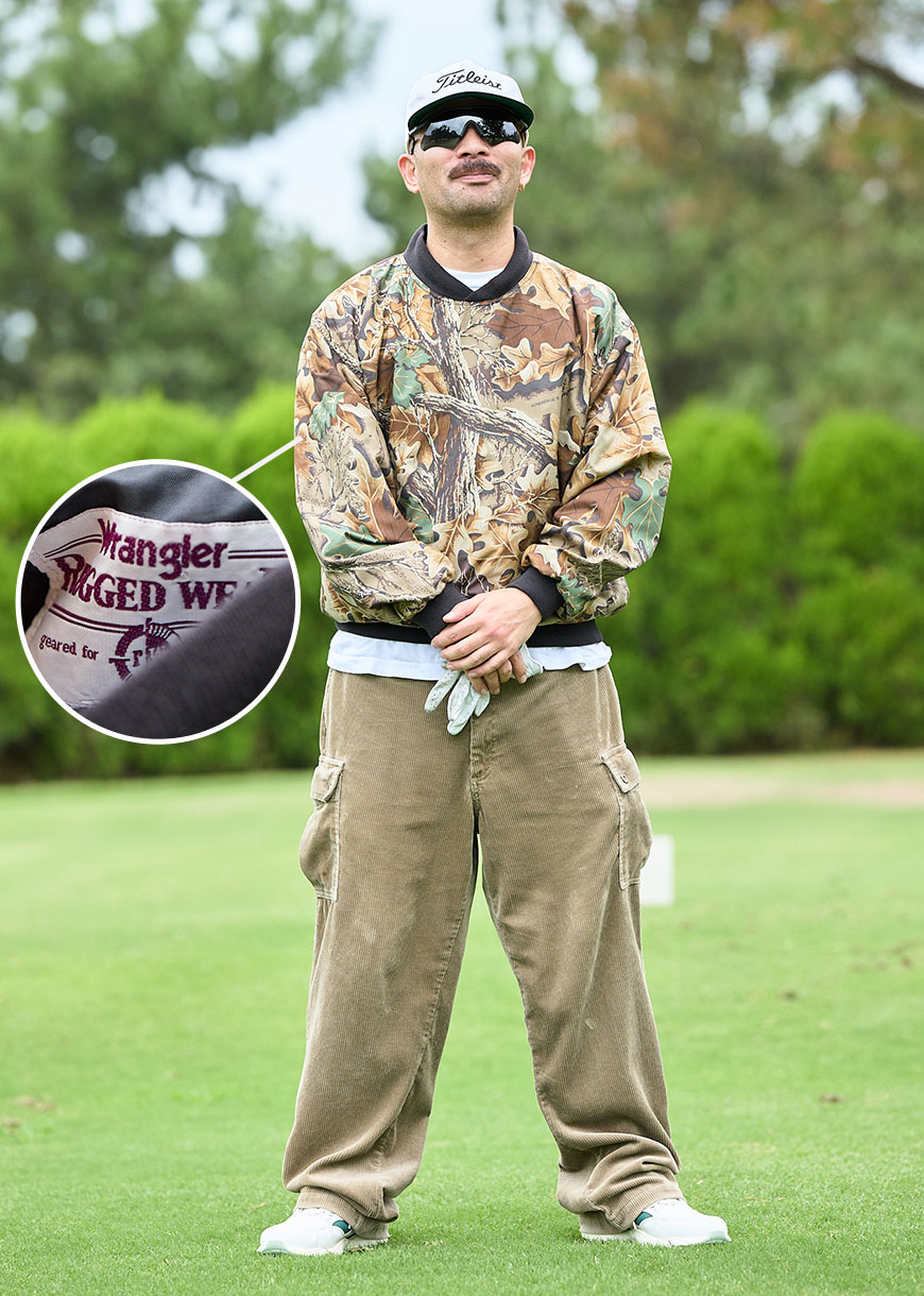 トップスは自身のブランド「FLOG.G.C.(フログゴルフクラブ)」でヴィンテージアイテムをリメーク。軍モノのミリタリーパンツとチャンピオンの高機能ジャージで再構築されたパンツもお洒落!