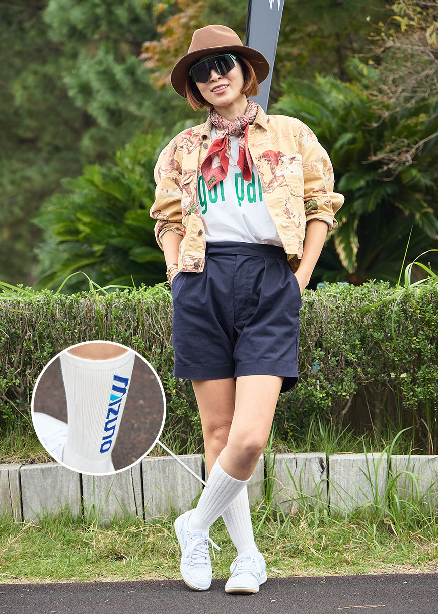 「ANTi COUNTRY CLUB × MALBON」のコラボニットポロに、オーバーサイズの白ショーツを合わせてちょっとルージーに。ゴルフの起源に深く関わった「リンゴの木」をモチーフにしたヴィンテージキャップをポイントに。