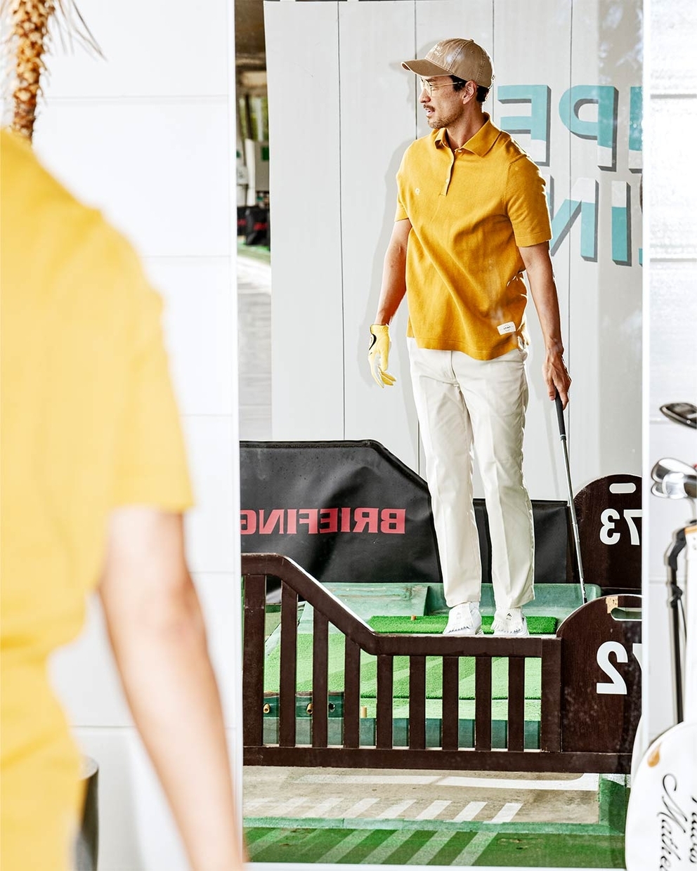 ニットポロシャツ¥28,600(パブリック ドリップ/オーサムゴルフ、F)、パンツ¥15,400(テーラーメイド アパレル、G)、キャップ¥6,380(サタデーズ ニューヨークシティ、H)、グローブ¥3,080(フットジョイ、D)、スパイクレスシューズ¥31,900(アディダス ゴルフ、E)、その他スタイリスト私物/すべて税込