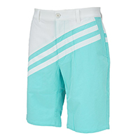 スポーティなモックネックシャツとショーツの組み合わせも、ミントグリーンのワントーンコーデに。ここでもトップスのロゴ使いとショーツの大胆なストライプ柄が遊び心を感じさせてくれます。サンバイザーも同系色なら、文句のつけようはありません。