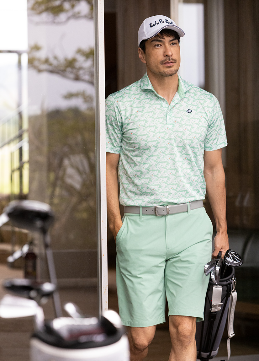 ポロシャツは同系色のショーツと合わせてワントーンコーデに。芝生が色濃くなるこれからの季節、一枚の絵のようにグラデーションが映え、清涼感もいっぱいです。素材は接触冷感、UVカットなどさまざまな機能を備える多孔素材。小衿のカッタウェイカラーで襟元を開けば、リラックスした気分を誘います。
