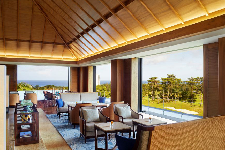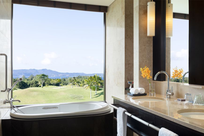 そんな「かねひで喜瀬カントリークラブ」を、ゲストルームはもちろん、館内の随所で間近に感じることができるのがザ・リッツ・カールトン沖縄に滞在する醍醐味(だいごみ)だ。1階ラウンジ、レストランに隣接するテラス、ゲストルームのバスルームやエレベーターホールに至るまで、窓の外には美しいコースビューが広がり、ゴルファーを高揚させる。