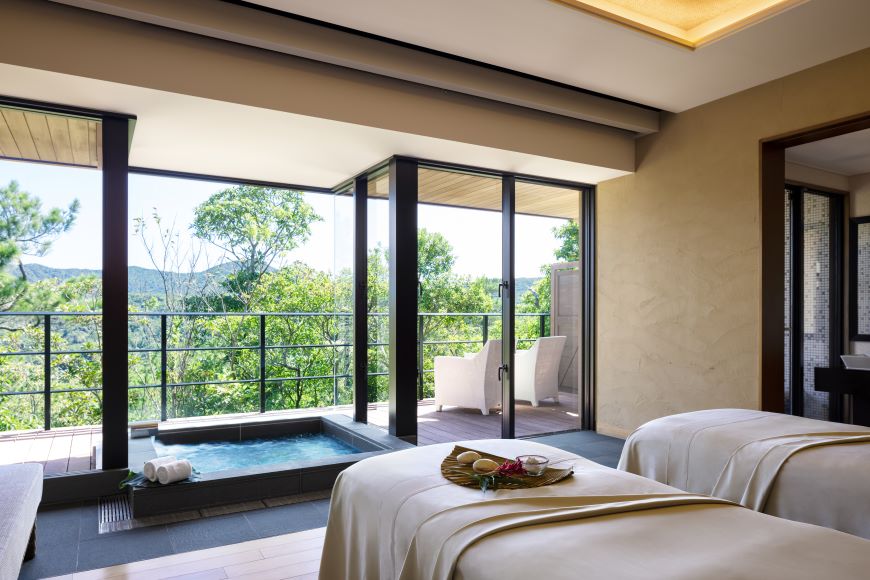 他にも琉球漆喰や琉球藍といった伝統技術や染料を用いた 「やんばるグリーン」や「名護ブルー」を基調とした空間は、柔和な雰囲気で癒される。日常の溜まった疲れがスルスルと解けていくのを実感できるはずだ。
