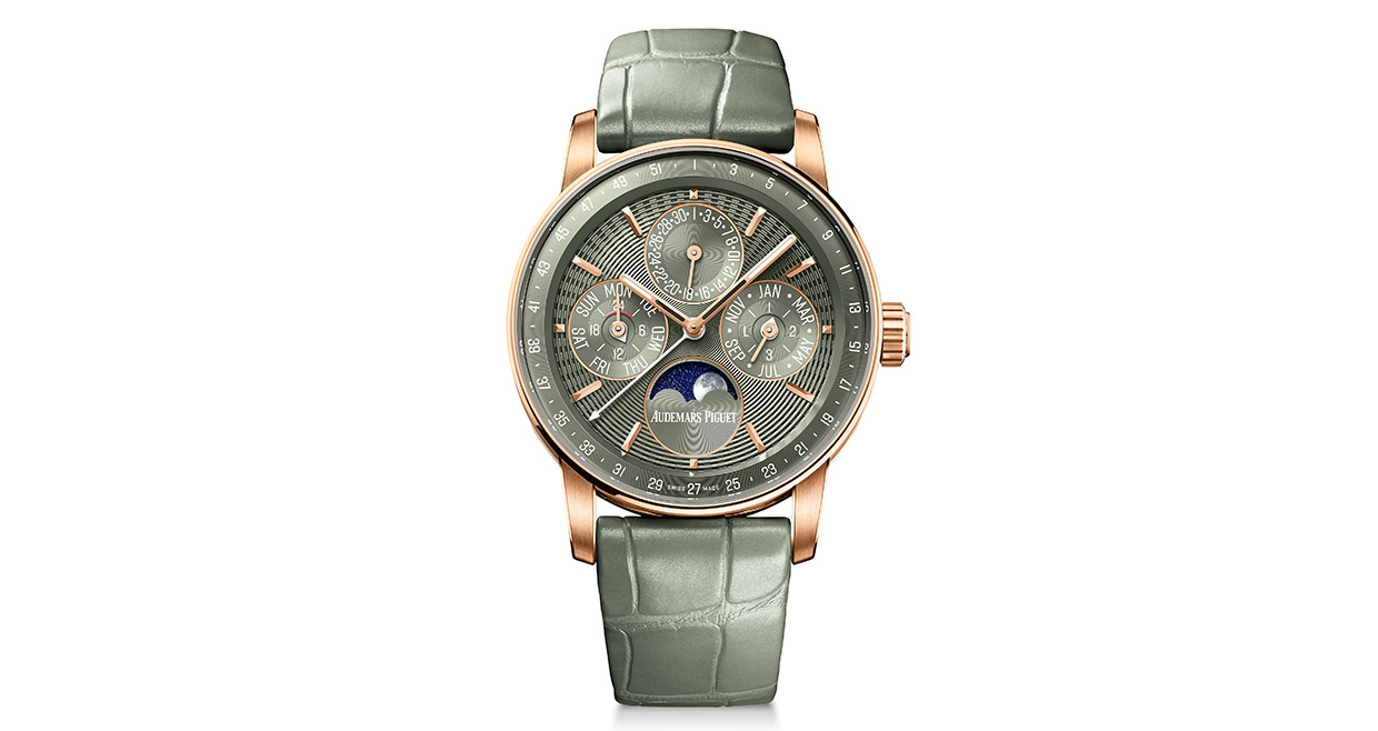 今回紹介する「CODE 11.59 バイ オーデマ ピゲ パーペチュアルカレンダー」は、そんなブランドの本質を体現する最新作だ。ケース径は38㎜。創業150周年を祝うアニバーサリーイヤーに登場した特別なサイズ感を備える。ダイヤルはギョーシェ職人ヤン・フォン・ケーネルとの共同開発によるエンボス加工。優しく奥行きを感じさせるグリーンの表情に、18Kピンクゴールドケースとアリゲーターストラップが調和し、控えめながら気品ある存在感を放つ。